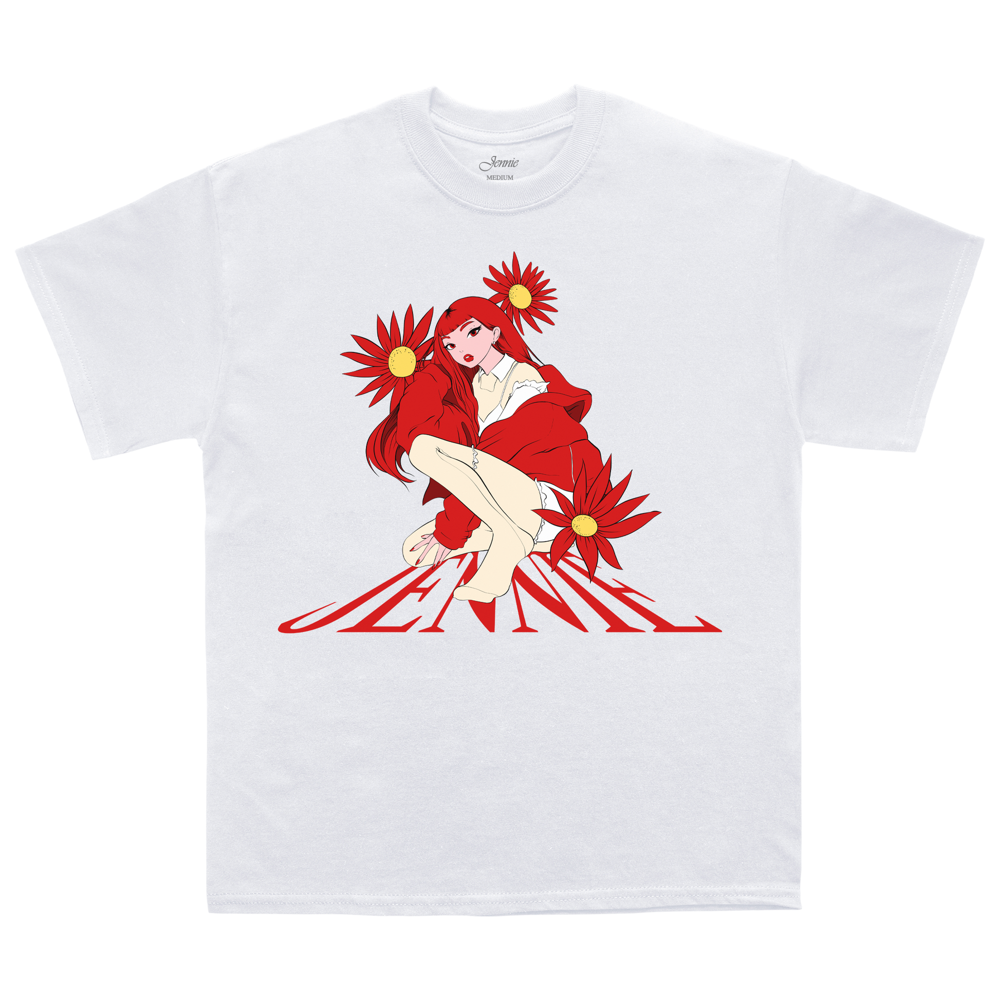 Jennie anime graphic printed on the front of a unisex, white tee.