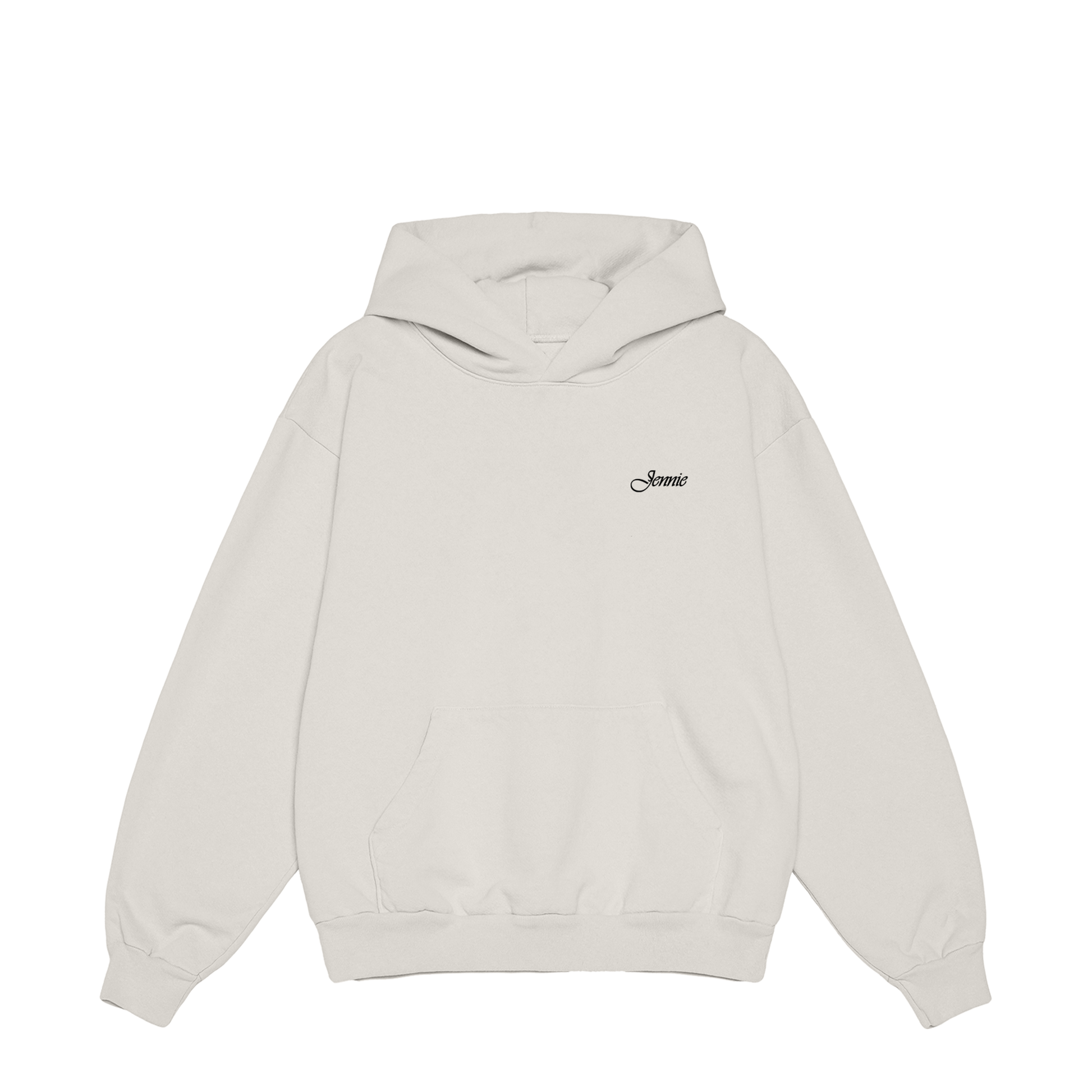 'Jennie' on the front and photo collage and lyrics printed on the back of a unisex, cream hoodie.